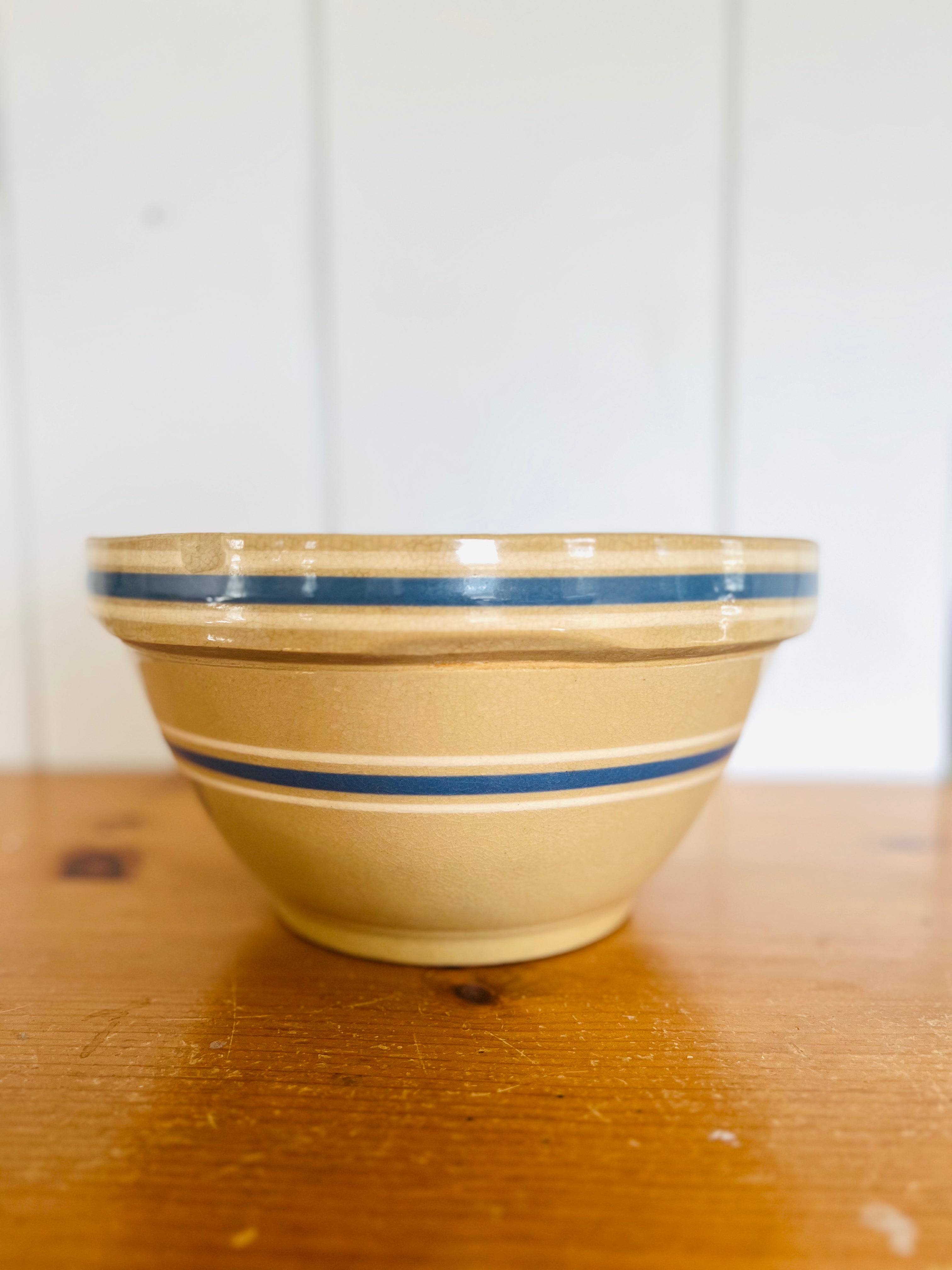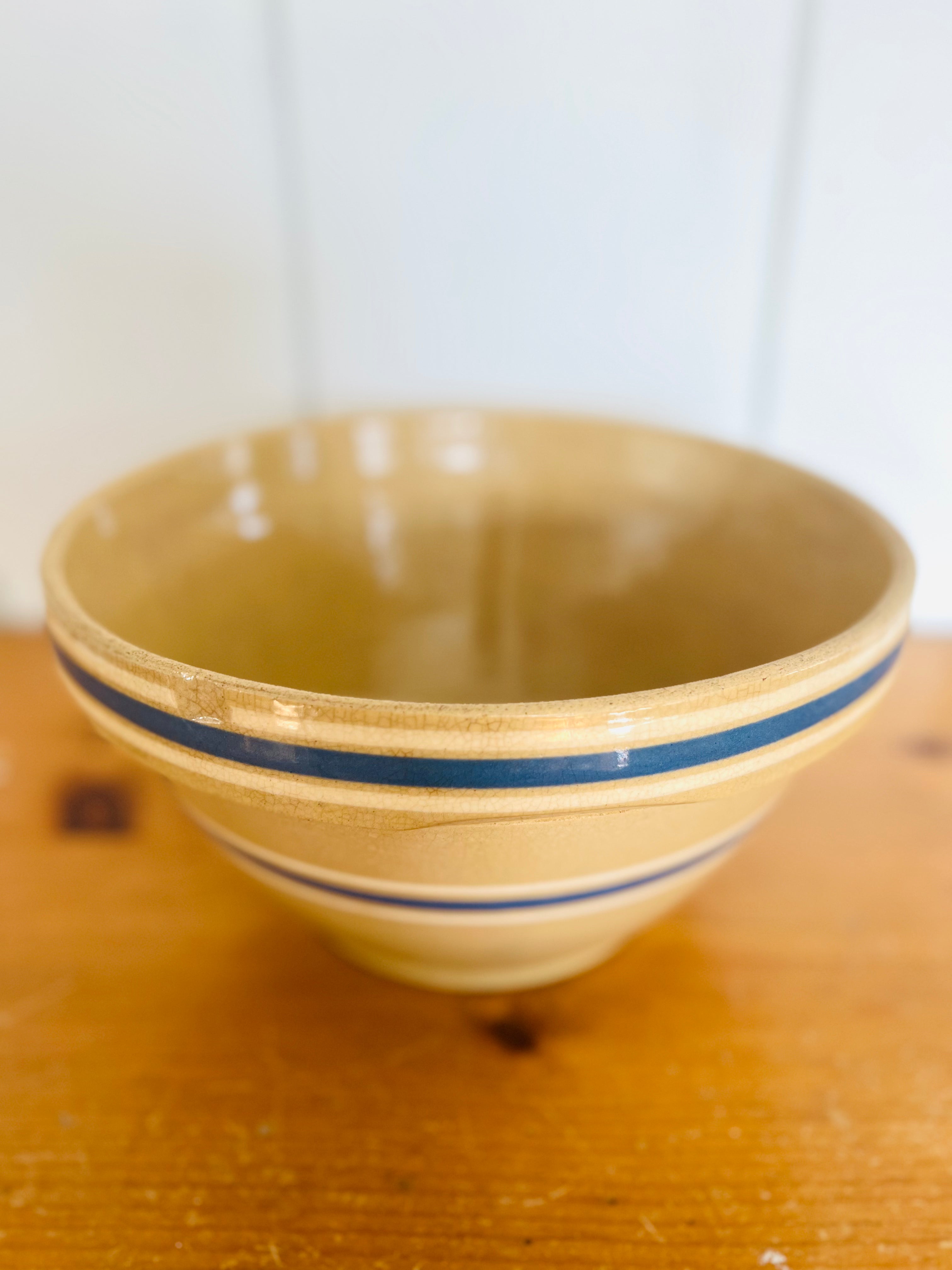 Vintage Ovenware Mixing Bowl. Circa 1940’s. Blue striping. Would make a great addition to a collector or a lover of vintage. Some , One chips. Big bowl has crazing and inside and out (as pictured). Glaze is bright and shiny. 10” rim. USA Made